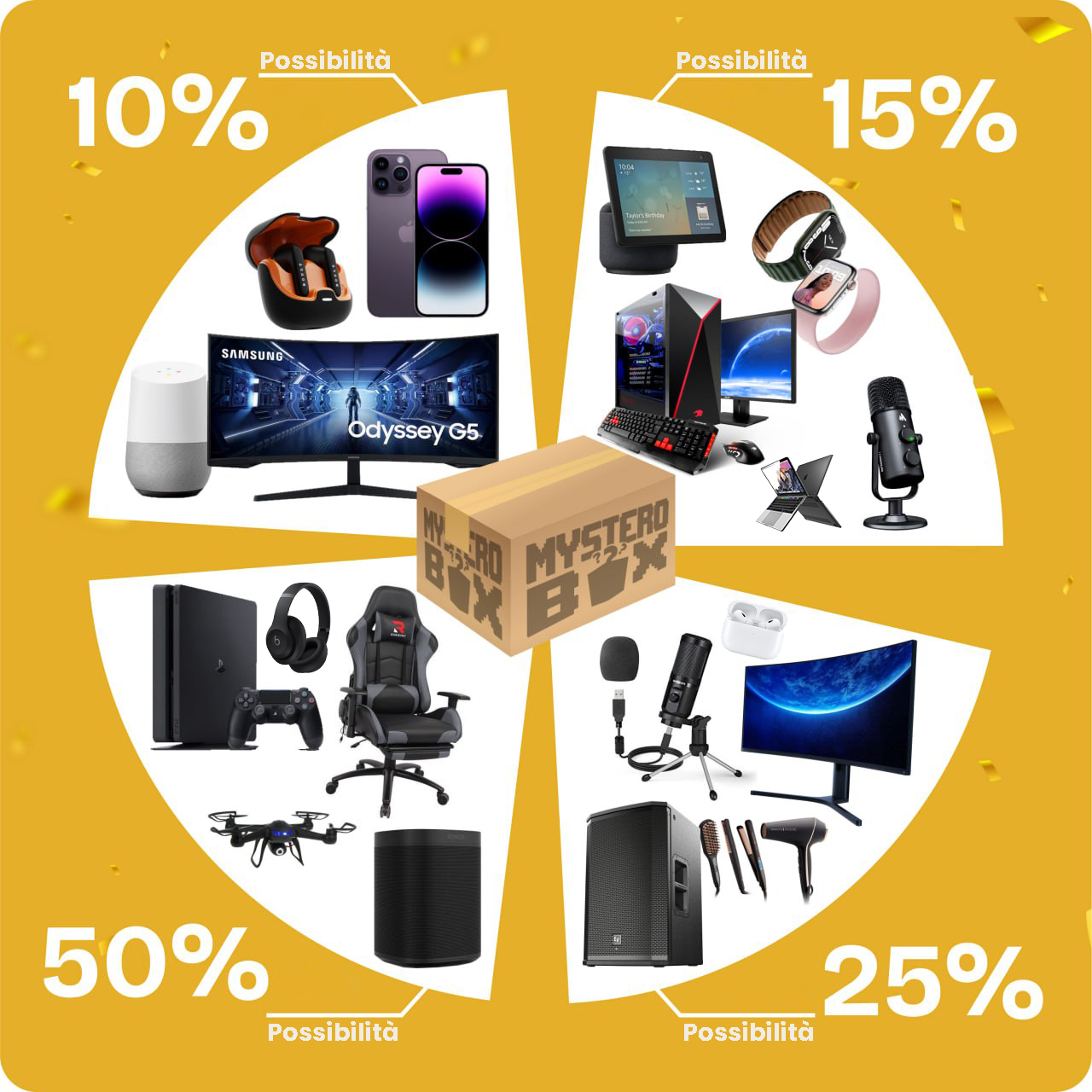 Ogni box contiene prodotti nuovi e originali di valore pari o superiore a quanto hai speso. I prodotti spaziano da elettronica di consumo a gadget tech, fino ad arrivare a premi top gamma come smartphone, console e accessori.
